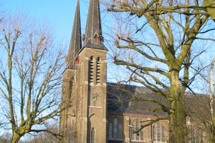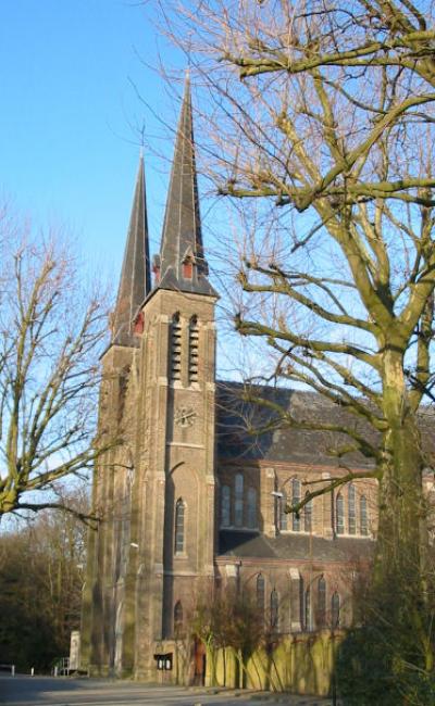 In 1873 the Marquise of Courtebourne-de Nédonchel had a Lourdes grotto built in the gardens of her château at Slotendries. People from Ghent and other nearby locations asked to be allowed to visit the grotto and pray there, and it was claimed that in 1875 Pieter De Rudderwas miraculously healed of a compound fracture.To accommodate the resulting increase in the number of pilgrims, a neo-Gothic church based on plans by E. Van Hoecke-Peeters (slightly modified by J. B. Bethune) was completed in 1876 and consecrated in 1877. It was entrusted to the Jesuits, to which the Marquis's late son had belonged. In one of the towers there is a carillon made up of 49 bells, cast by the Michiels Foundries in the 1950s. The keyboard was temporarily removed during renovation works in the 1970s but has not yet been replaced to this date.
