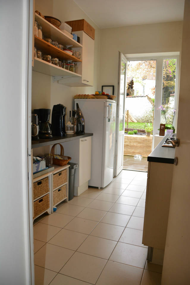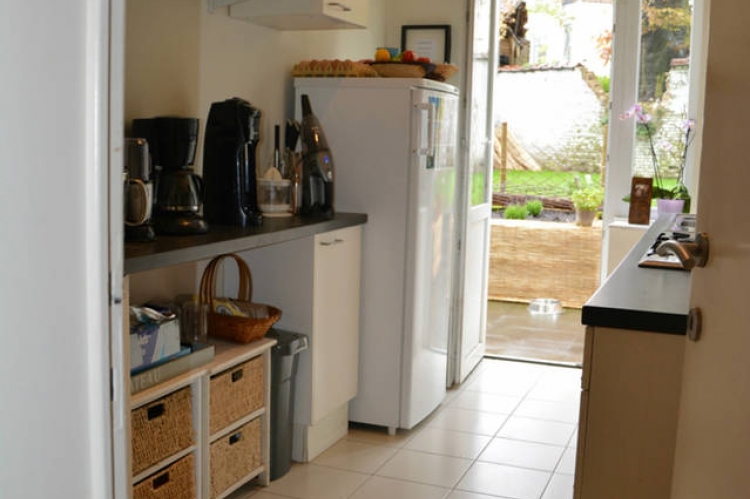 The kitchen has access to our garden and comes with everything needed to make yourself a nice meal if you'd like (stove, cooking plates, pots, pans, plates, juicers, blenders etc...).